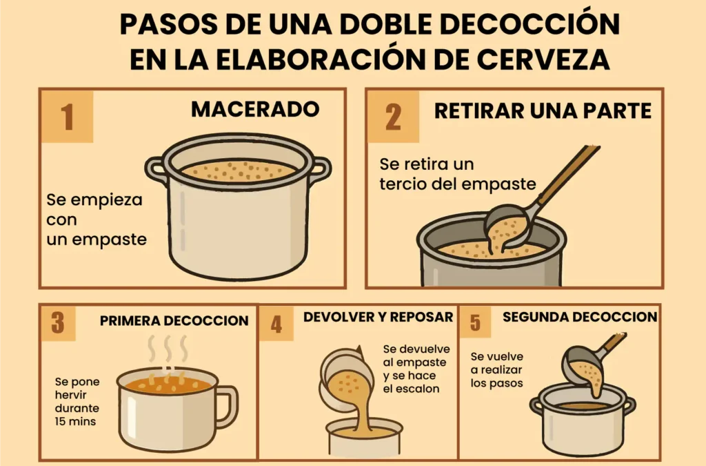 El proceso varía según el número de decocciones que se realicen, pero sigue una estructura común que se repite en cada extracción. Esta técnica permite subir progresivamente la temperatura del macerado usando parte del propio grano hervido, sin necesidad de aplicar calor directo a todo el mosto.