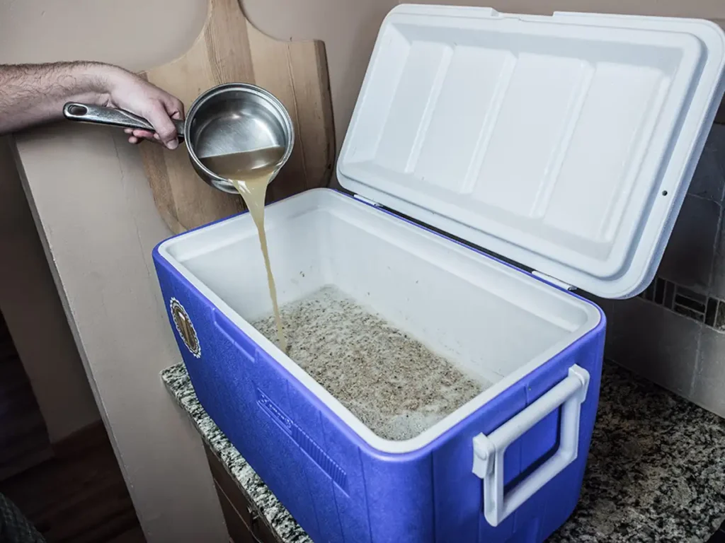 Nevera térmica adaptada para usar como macerador. Conserva muy bien la temperatura y permite hacer infusión simple sin necesidad de calentadores.
